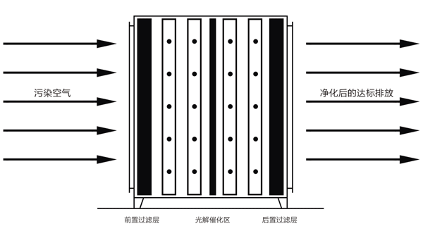 利用特質(zhì)的高能高臭氧UV紫外線光束照射VOCs氣體,利用二氧化鈦為催化劑,改變廢氣中有害成分子鏈結(jié)構(gòu),使其降解轉(zhuǎn)變成低分子化合物,如CO2、H2O等。