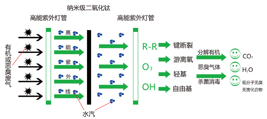 本產(chǎn)品利用特制的高能高臭氧UV紫外線光束照射惡臭氣體和TiO2光催化,催化裂解惡臭氣體如:氮、三甲胺、 硫化氫、甲硫氫、甲硫醇、二甲二硫、二硫化碳、苯乙烯、VOC類,苯、甲苯、二甲苯,使有機(jī)或無機(jī)高分子惡臭化合物分子鏈,在高能紫外線光束照射下,降解轉(zhuǎn)變成低分子化合物,如CO2、H2O等。
