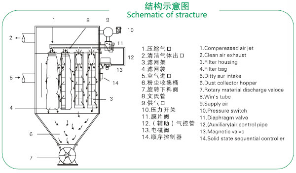 含塵空氣進(jìn)氣口進(jìn)入除塵箱,因氣體突然擴(kuò)張,流速驟然降低,顆粒較粗的粉塵,靠其自重力向下沉降,落入灰斗。細(xì)小粉塵通過各種效應(yīng)被吸附在濾袋外壁,經(jīng)濾袋過濾后的凈化空氣,通過文氏管進(jìn)入上箱體,從出氣口排出,被吸附在濾袋外壁的粉塵,隨著時(shí)間的増長,越積越厚,除塵器阻力逐漸上升,處理的氣體量不斷減少,為了使集塵器經(jīng)常保持有效狀態(tài),設(shè)備阻力在一定的范圍內(nèi),就需要清除吸附在濾袋外面的積灰。