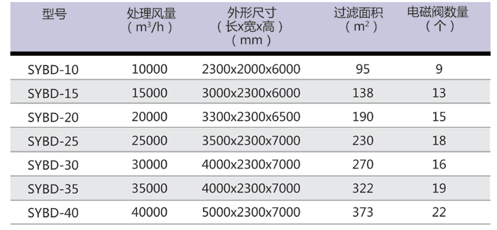 SYBD型脈沖布袋式除塵設(shè)備主要參數(shù):