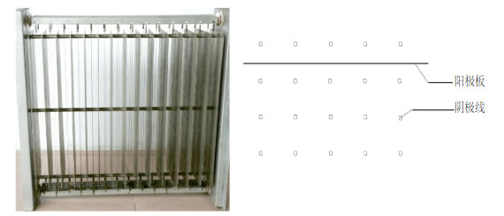 板線式電場,工藝簡單,成本低。陽極成板狀,收塵面積比較小,陰極到陽極距離不相同,電場強度不均勻,且清洗不方便,長期使用會影響處理效果。